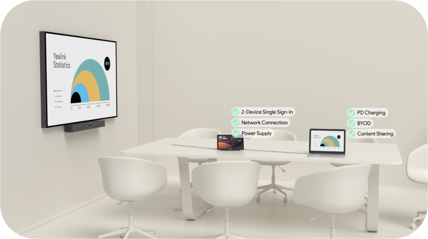 The One-Cable Solution simplifies deployment and sharing in 2 ways. A single Cat5e cable from the bar to the touch console provides power and network connectivity to the touch console, eliminating extra cables. Signing in on the CTP25 synchronizes the entire system, removing the need to sign in on the touch console. Additionally, a single USB-C cable from the CTP25 to the PC enables 4K sharing, BYOD, and PDcharging.