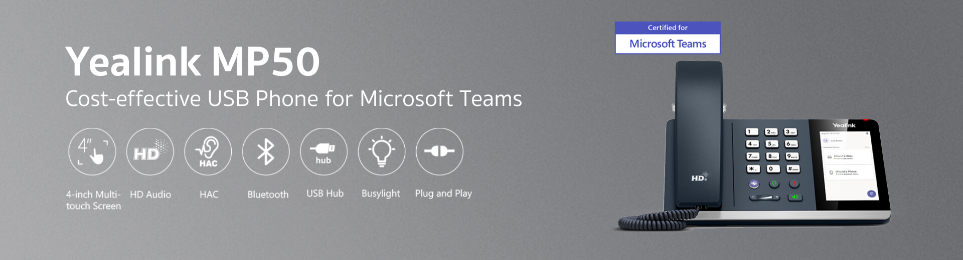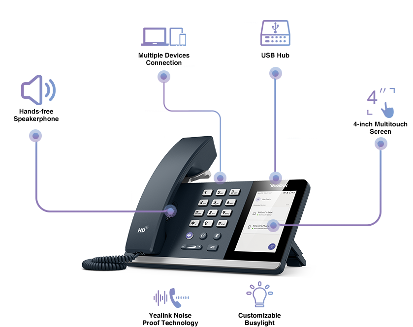 With USB and Bluetooth connectivities, hands-free speakerphone, 4-inch multi-point touchscreen and USB hub feature, the MP50 is able to integrate multiple devices into a single phone for unified call controling.
