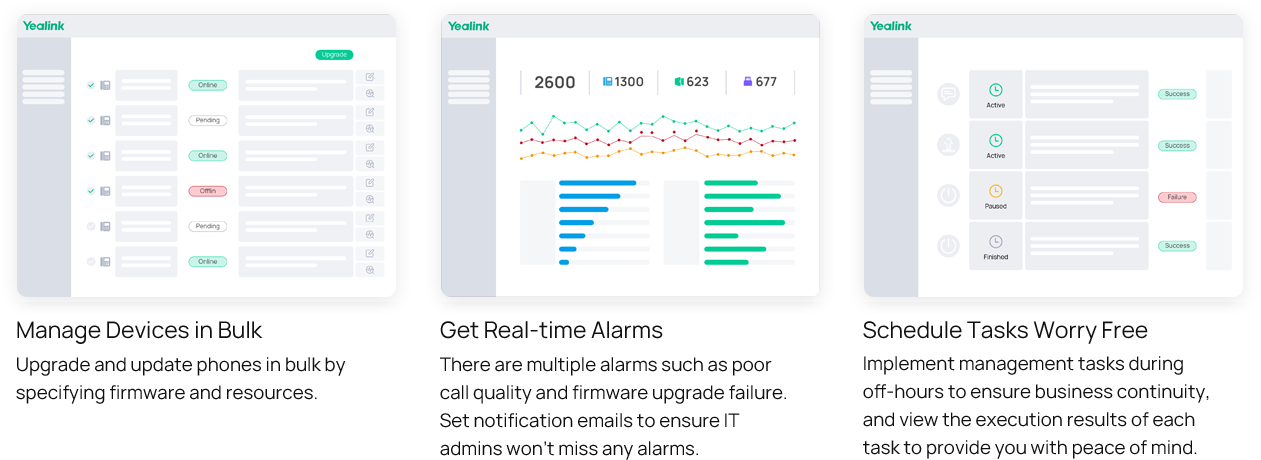 Master teams phones in bulk with professional management platforms such as Microsoft Teams Admin Center (TAC) and Yealink Management Cloud Service (YMCS). Upgrade and update phones in one time, and get real-time alarms such as poor call quality or firmware upgrade failure.