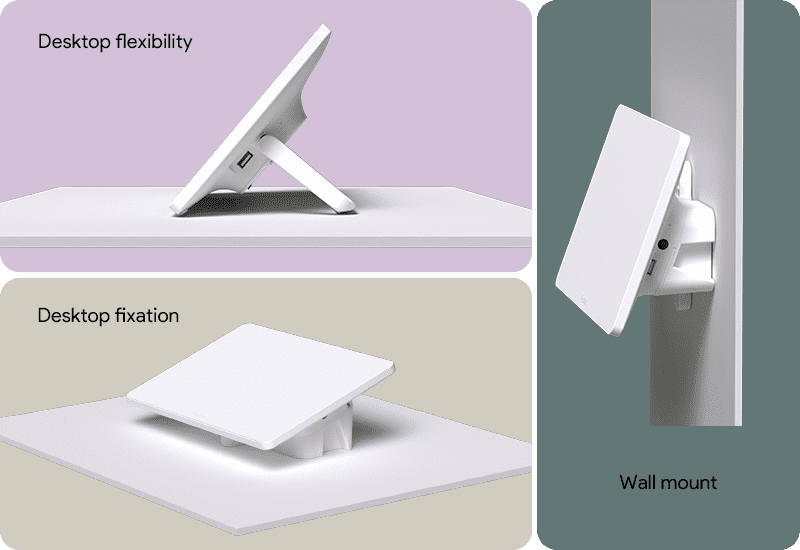 MTouch Plus-EXT supports three installation options: wall-mount, desktop fixation, and desktop flexibility. Being on the same network as MTouch Plus enables its usage without distance limitations, allowing it to adapt to various spaces as needed.
