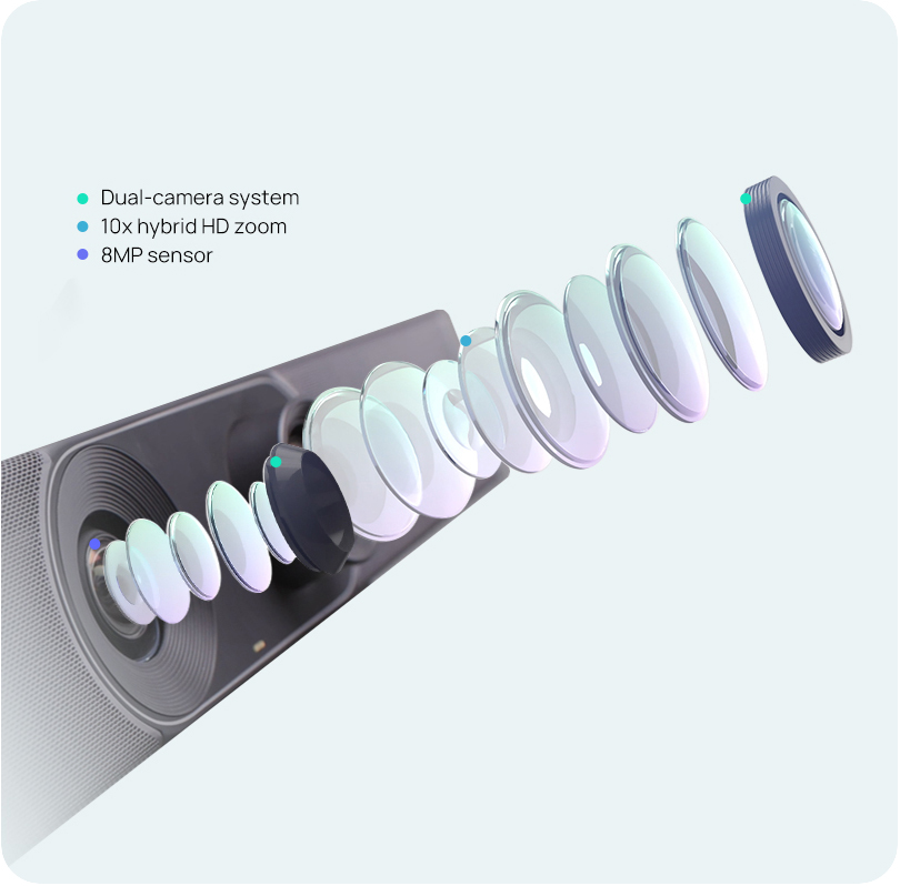 MeetingBar A30 dual-camera system is perfect for medium rooms. It features an optical camera with 10x hybrid zoom and an 8-megapixel digital camera with a 120° field of view, delivering a clear visual experience with depth, which is unable to be achieved with a single camera for zoom meetings.
