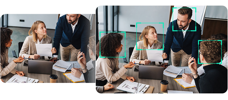Auto Framing recognizes the number and the positions of attendees, framing everyone smoothly in the most appropriate view even in small spaces.
