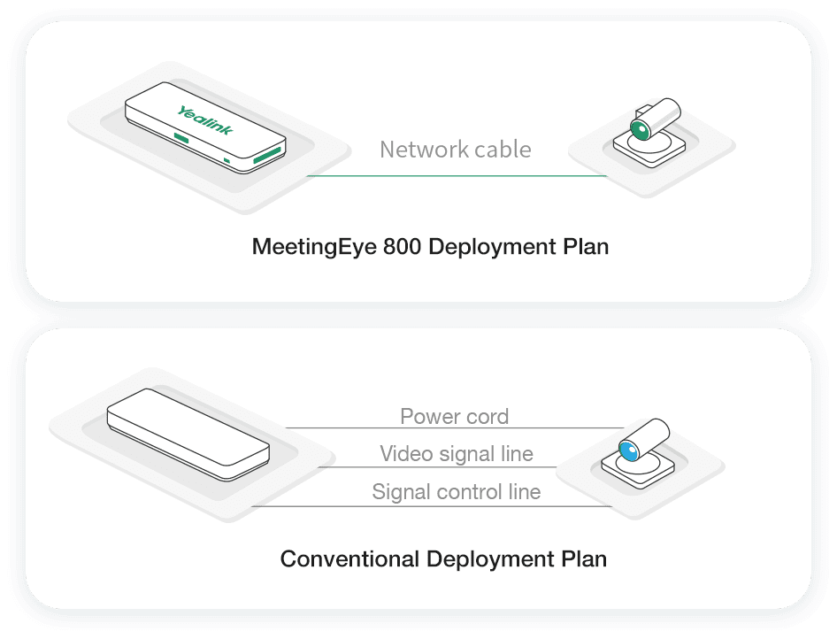 MeetingEye 800 adopts a detachable design, which supports installation and deployment such as hanging on the wall, placing on the table, hanging under the table and placing on the cabinet. Through VCH interface, the product integrates data transmission, signal control, and power supply with only one multi-function line. The accessories and the host can be connected with only one network cable, simplifying the layout of video conferencing room lines and reducing deployment costs.