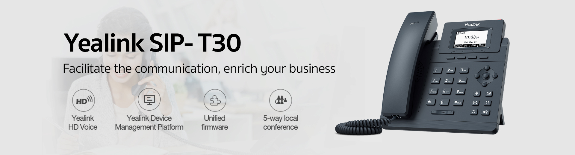 A classic IP phone for small business users, the SIP-T30 delivers a fashionable and user-friendly dialing experience. It has a generously large 132x64-pixel graphical LCD that guarantees an easier access to much more visual information at a glance. Dual 10/100 Mbps network ports makes SIP-T30 an ideal choice for extended network use. The SIP-T30 offers support for single VoIP account and includes 5-way local conferencing. It includes EHS35 support for Yealink wireless headset plus adjustable multi-angle stand support and has been designed very specifically for efficient work.