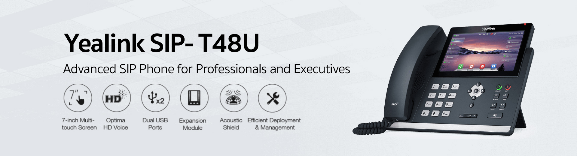 Yealink presents a dynamic business communication solution to executives and professionals with the new SIP-T48U IP phone. The phone employs an appealing large touch screen that makes the switch between pages and applications swift, easy and convenient. Integrated with Hall Switch, T48U gives you a quieter operation and environment. United Yealink Optima HD Voice technology, the T48U awards you the superb audio quality and crystal-clear voice communications. Moreover, the T48U puts dual USB ports in a phone that makes Bluetooth, Wi-Fi, USB headset and USB recording come true, and you can use any two of them freely according to your needs. The Yealink new T4U series offers the same elegant appearance as the T4 line, but with improvements for greater interoperability and better collaboration. The T4U series better builds the Yealink ecosystem and is compatible with more Yealink headsets, supporting intelligent channel switching* and using the phone to configure and upgrade headset.