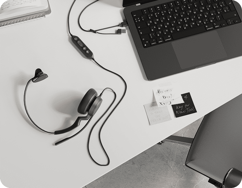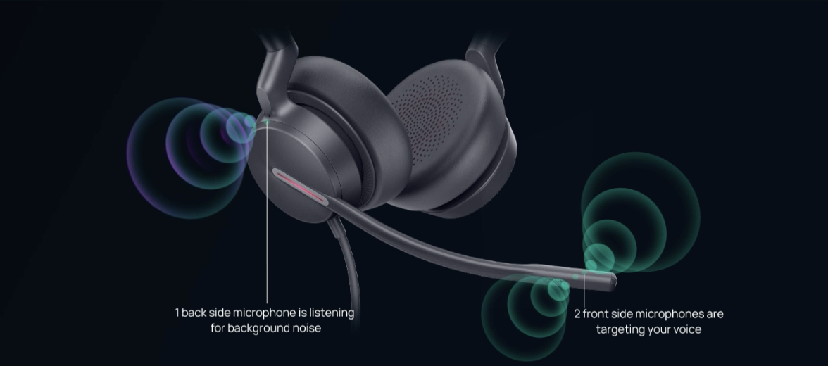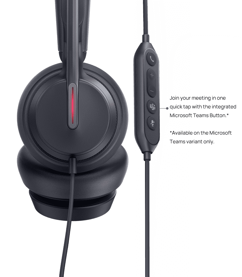 Dual busylights for all-angle visibility. Flexible dual-side wear for ultimate versatility. Lift the mic boom to instantly mute.