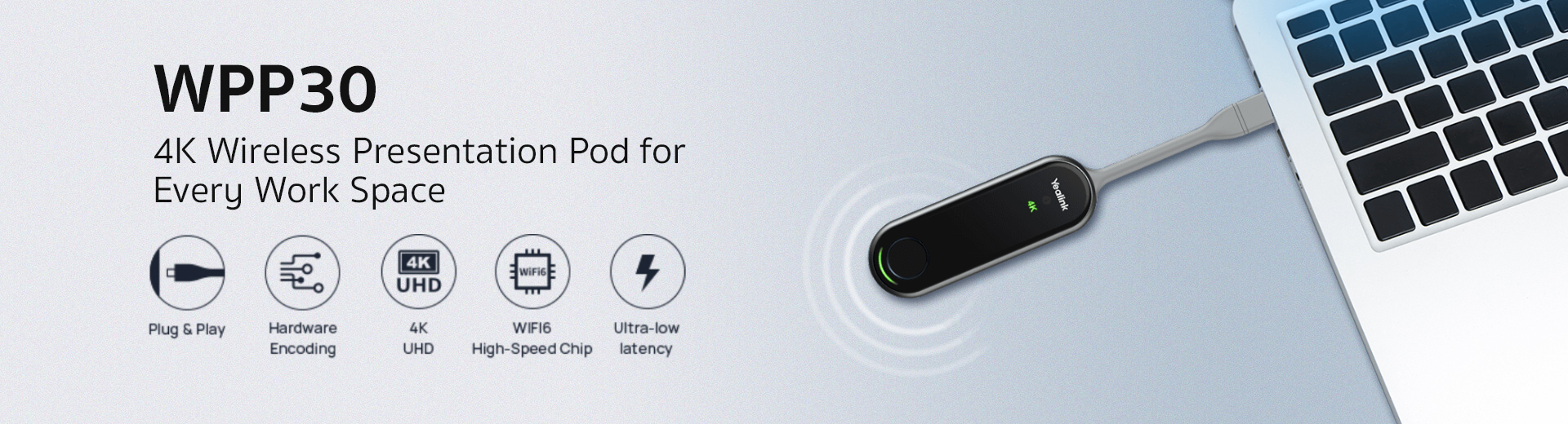 Featured with a compact size and intuitive industry design, Yealink wireless presentation pod WPP30 brings a trouble-free content-sharing experience to any conference room. Empowered with up to 4K/30FPS UHD hardware encode streaming output, WPP30 saves a lot of effort by eliminating the installation of any software or driver. Thanks to the high-performance 2x2 MIMO, Wi-Fi 6 module, WPP30 delivers a super clear, speedy and stable casting experience with low latency.